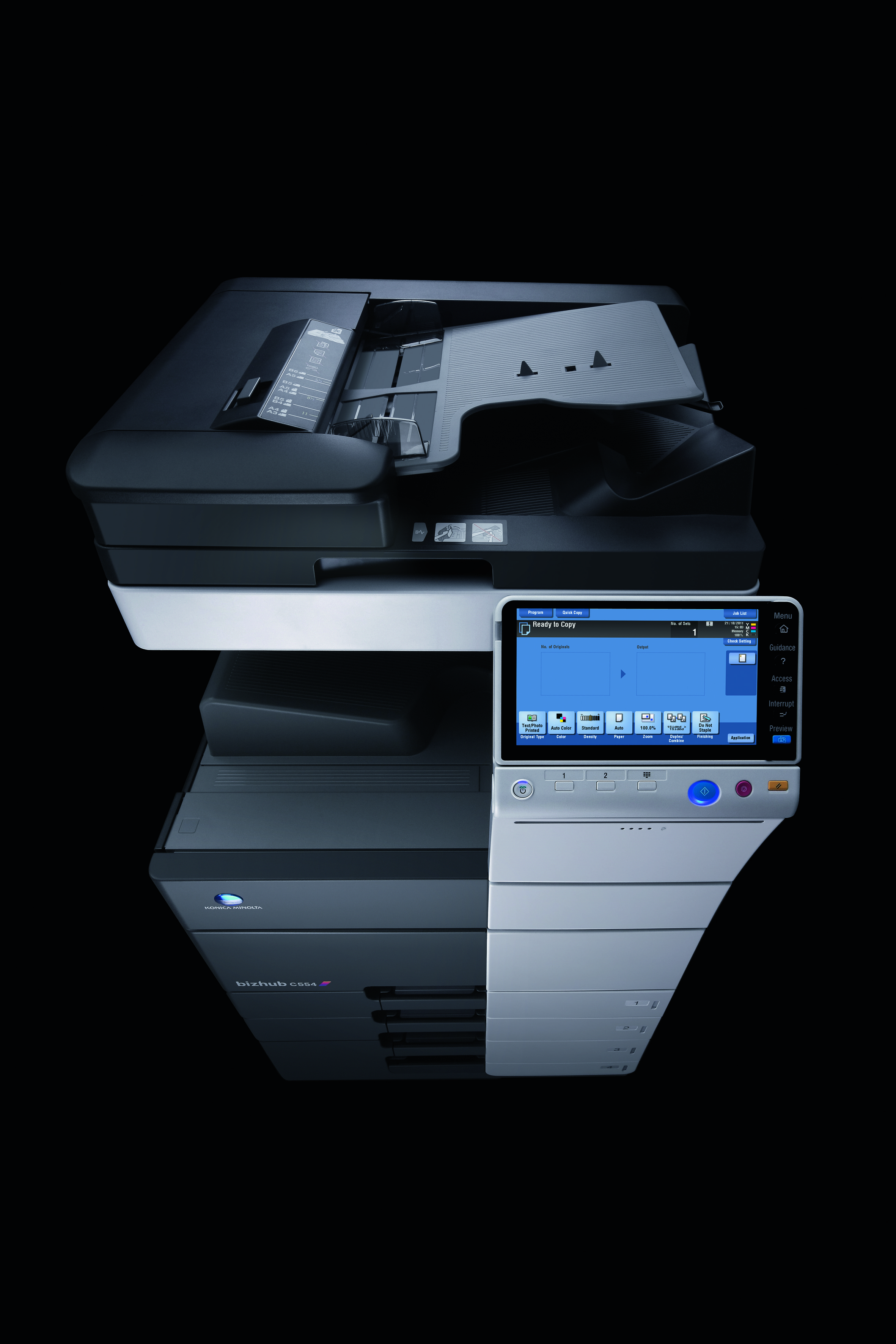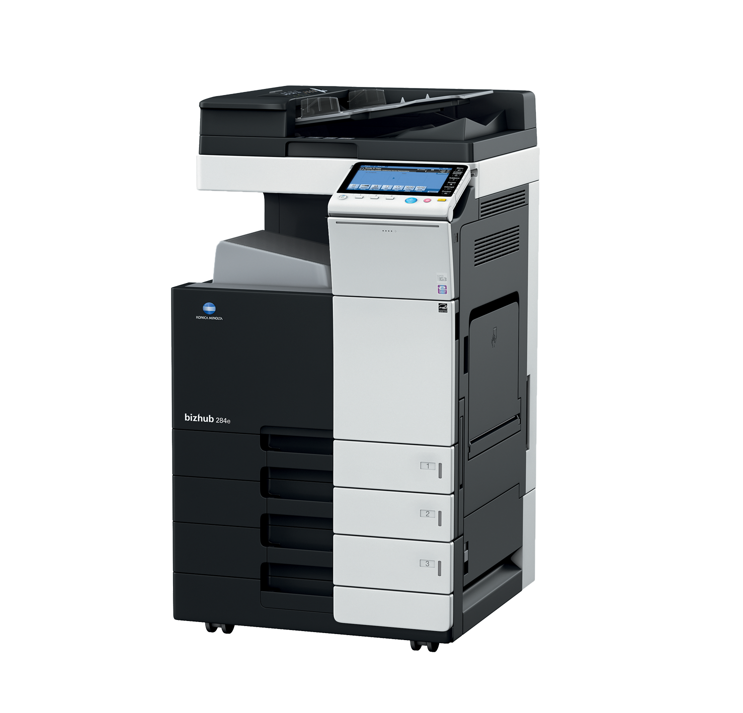- Opcjonalne podajniki papieru: Taca 3: 500 arkuszy, A5-A3, 52-256 g/m², Taca 3 + 4: 2x 500 arkuszy, A5-A3, 52-256 g/m², Kaseta o dużej pojemności: 2,500 arkuszy, A4, 52-256 g/m²