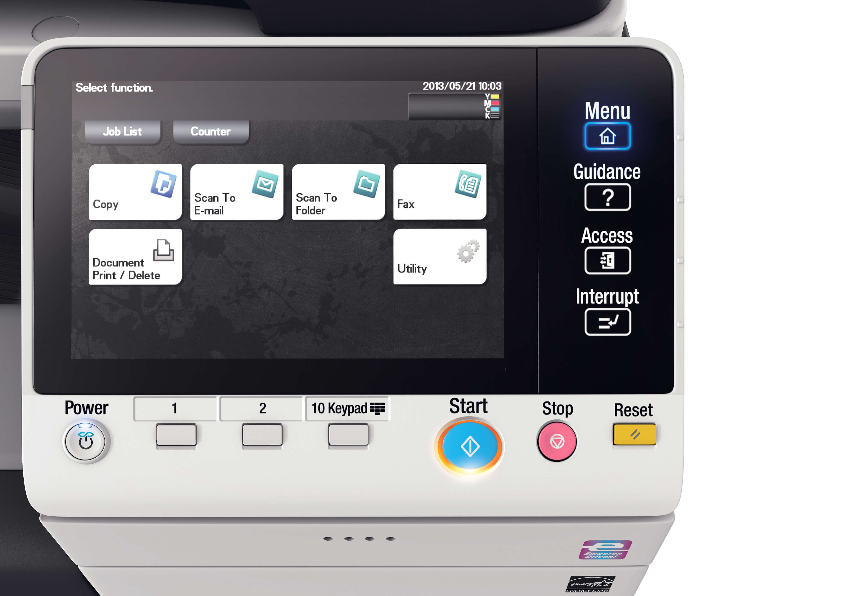 - Funkcje kopiowania: Sortowanie elektroniczne, obsługa wielu zadań, ustawienia (kontrast, ostrość, gęstość obrazu), kopia próbna, tryb przerywania, tryb koloru, osobne skanowanie, sortowanie/ grupowanie, łączenie, wybór oryginału kopiowanie dokumentów; kopia 2 na 1; kopia 4 na 1